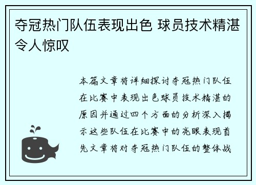 本篇文章将详细探讨夺冠热门队伍在比赛中表...