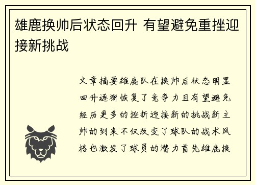 文章摘要:雄鹿队在换帅后,状态明显回升,...