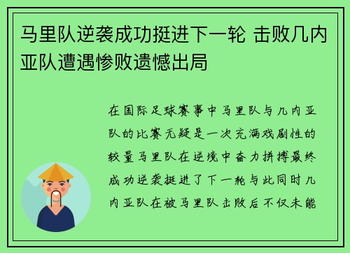 在国际足球赛事中,马里队与几内亚队的比赛...