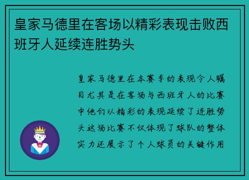 皇家马德里在本赛季的表现令人瞩目,尤其是...
