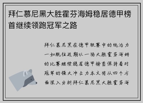 拜仁慕尼黑在德甲联赛中的统治力一如既往,...