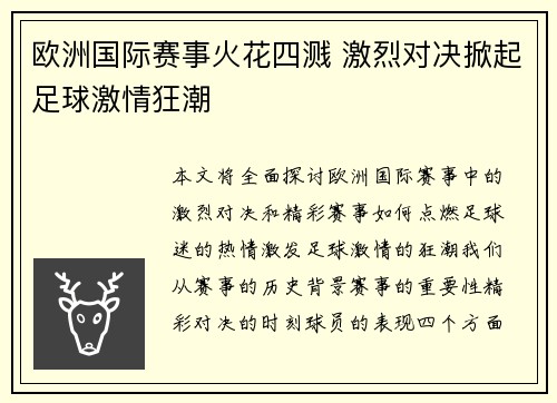 本文将全面探讨欧洲国际赛事中的激烈对决和...