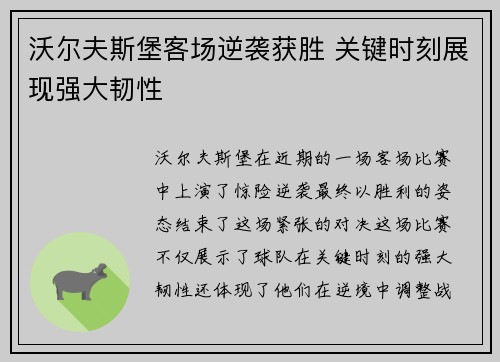 沃尔夫斯堡在近期的一场客场比赛中上演了惊...