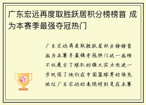 广东宏远再度取胜跃居积分榜榜首,成为本赛...